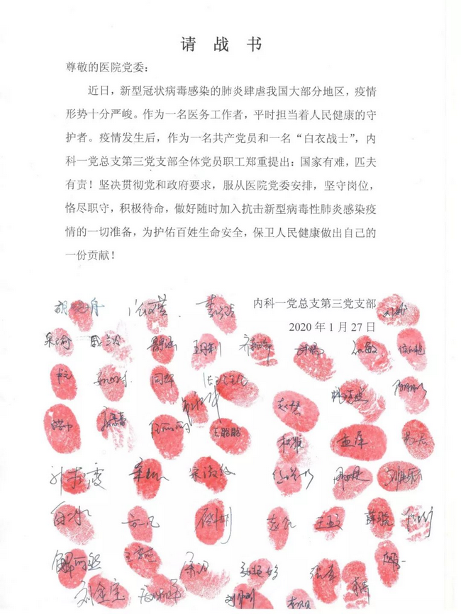 疫情发生后,内科一党总支第一党支部、第二党支部、第三党支部,急诊科、全科医学科的党员同志们,心血管内科三病区护师、发展对象郭亚楠都写下了请战书、决心书。还有伽玛刀科刘美艳和退休职工张莉等通过短信或微信等形式向党委书记王新军表达了支援武汉、抗“疫”一线的心声,体现了郑州大学五附院党员职工的责任、担当和情怀。一个个熟悉的名字,一个个鲜红的手印,一个个抗击疫情的心声,表达了一个个共产党员的理想与信仰,展示了一个个白衣战士的职责与使命!疾风知劲草,烈火炼真金,越是关键时刻越能检验初心使命,越是勇毅担当越能看出党性成色。我院各级党组织和广大党员干部职工不负重托,以实际行动践行了入党誓言和初心使命。万众一心、同舟共济,我们定能打赢这场疫情防控阻击战!