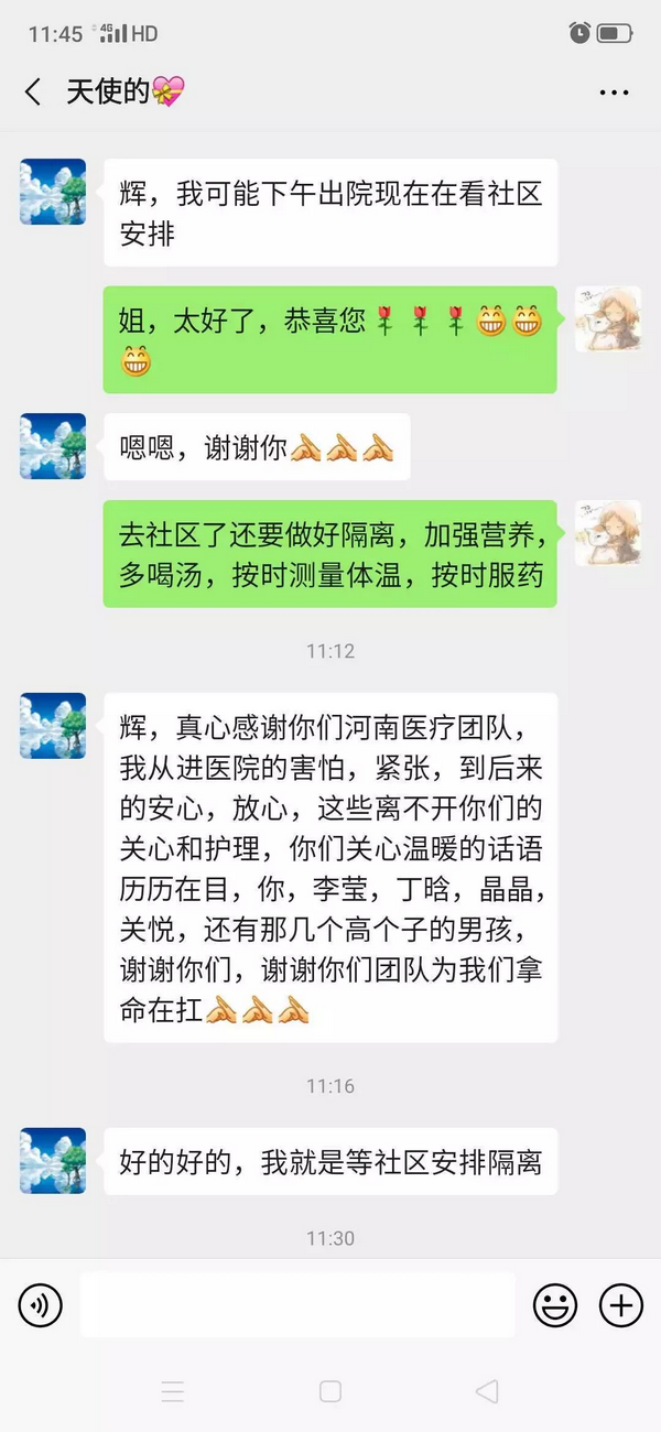 上午十一点左右,我又突然接到一位大姐发来的喜讯,“辉,我可能下午出院”。短短几行字,难掩喜悦。我也非常高兴。我知道这位大姐的情况,她的家人多人感染入院,其深爱的母亲更是住进重症监护室。她刚入院的时候,心情非常焦虑,吃不下,睡不好。我看在眼里急在心头,为鼓励她就把联系方式给她,告诉她有什么事都可以随时告诉我。以后的每天,都能收到她的微信,她会跟我讲她今天的感觉,跟我讲她的家人,分享她的心情。休息的时候看到,我都会及时回复,互相加油鼓劲。她对我说:我信任河南医疗队,看到你们就很放心。今天,她也是第一时间告诉了我,自己要出院的好消息。她在微信里写道:“辉,真心感谢你们河南医疗团队,我从进医院的害怕,紧张,到后来的安心,放心,这些离不开你们的关心和护理,你们关心温暖的话语历历在目……谢谢你们,谢谢你们团队为我们拿命在扛。”