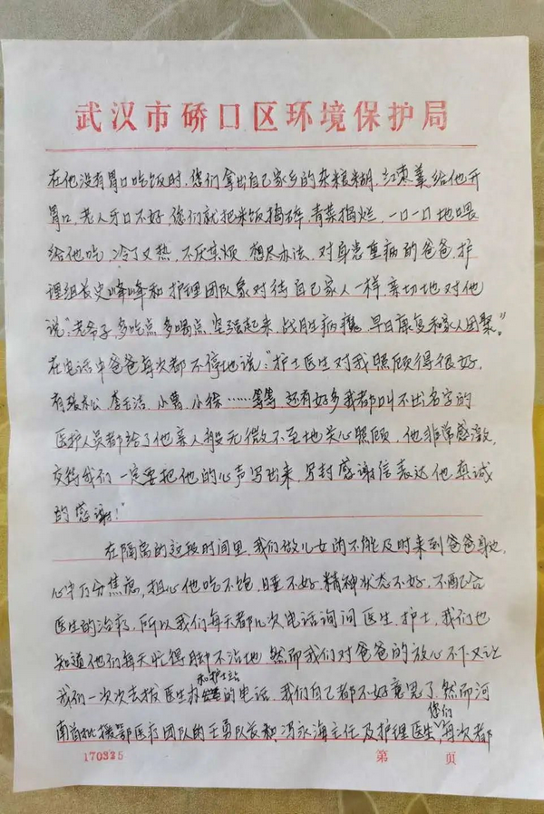 “我爸年近八十,入院当晚便开始吸氧,病情严重,已身不由己,吃喝拉撒全在床上,生活完全不能自理。是您们,河南首批援鄂医疗团队的医护人员,穿着厚厚的隔离服,亲切地询问范老先生的病情,并给予合理的治疗,耐心地每一天每一餐喂水、喂药、喂饭,还有及时地更换纸尿裤并擦洗,您们不怕脏,不怕累,如亲人般的照顾……”