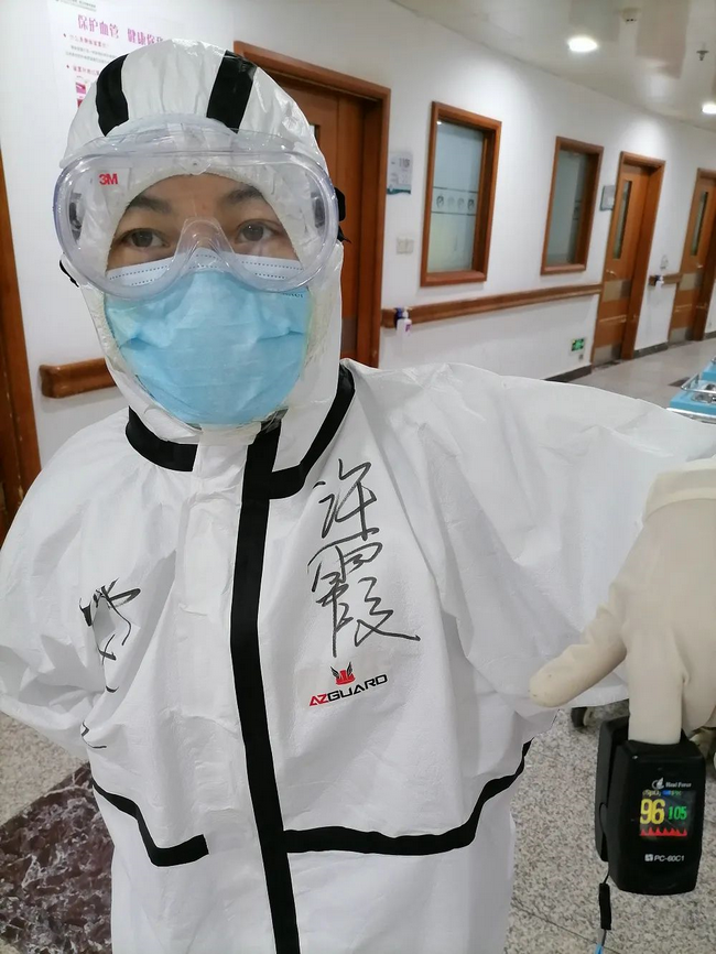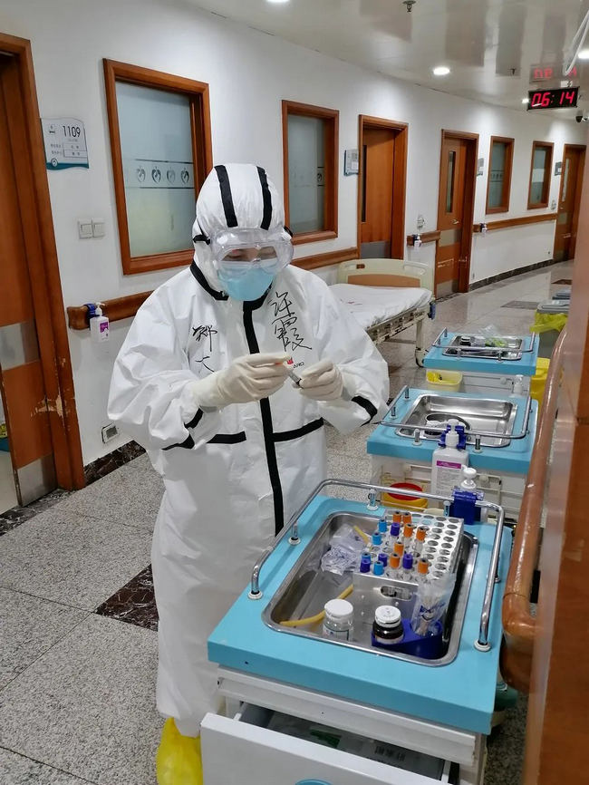 高广甫主任和万琳老师,被我们年轻队员亲切地称呼为“高爸爸”和“万妈妈”,他们时刻操心着我们的衣食住行和防护安全。每次吃饭时,“万妈妈”就会在走廊里高喊一声:孩子们,吃饭去喽!阳光明媚时,“高爸爸”就会把我们的外衣拿到太阳底下进行“集体消杀”。我们的安检员“刘小叔”刘培杰副主任主要负责我们的安全检查,他是11楼病区的组长,每次进病房前都会再三确认大家的防护服是否穿好,口罩、帽子、护目镜是否带好,确保万无一失,他才会松一口气。他常说,我把你们怎样带来的就怎样带回去。我们的心理导师“卢大姨”卢仁辉护士长,前期繁重的工作让她熬红了双眼,但她毫无怨言,依然坚守岗位。值班结束,她总会无意间和队员聊聊天,观察他们的心理动态,是否想家了?心情为什么低落?及时给予必要的心理疏导。亲切的“李小姨”李晶护士长总会把药品和生活用品一一送到我们手里。我最敬佩的付群“付哥哥”:工作中认真严谨,他曾经支援过艾滋病村,参加过“抗击非典”,经历过两大“战役”的他这次积极主动参加援鄂行动。和见过“大世面”的他一起工作,我安心许多。在生活中,绝对的好男人一枚,空闲时他总会默默地为大家热好饭菜,等待我们下班归来。我们那一群帅气的弟弟们,颜值和力量担当,当需要扛东西,搬物资时,他们首当其冲。夜幕降临,我们的“冯叔叔”冯永海主任开始查寝了,他有着一套引以为傲的查寝方式,能准确地察觉出谁还没有休息。“那谁谁赶快睡觉了啊”,“那谁谁别再聊天了啊”,时刻提醒着我们要休息好,注意身体健康。