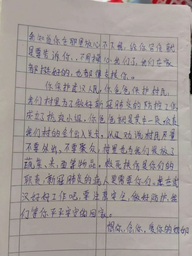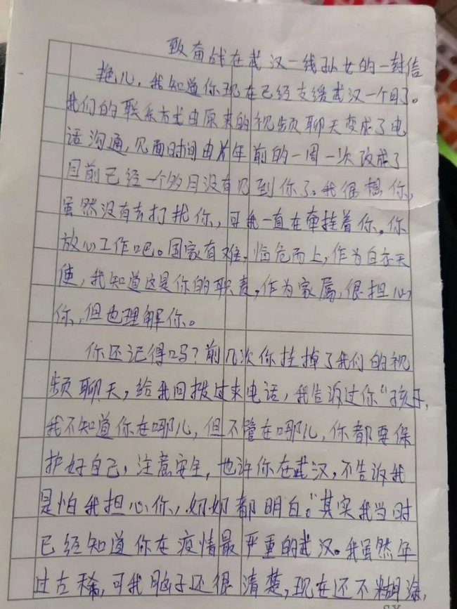 你还记得吗?前几次你挂掉了我们的视频聊天,给我回拨过来电话,我告诉过你“孩子,我不知道你现在在哪儿,但不管在哪儿,你都要保护好自己,注意安全,也许你在武汉,不告诉我是怕我担心,奶奶都明白。”其实我当时已经知道你在疫情最严重的武汉。我虽然年过古稀,可我脑子还很清楚,现在还不糊涂,我知道你在那里放心不下我,给你写信,就是要告诉你,不用操心我们了,我们在家都挺好的,也都很支持你。