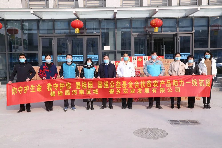 碧桂园河南区域 碧乡农业发展有限公司向医院捐赠260套(蔬菜、苹果、山药、烩面、挂面)扶贫农产品。目前已分发到援鄂医疗队队员家属、医院发热门诊的一线工作人员和下属社区卫生服务中心工作人员手中。