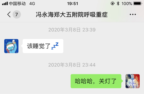 “叮”,收到了“冯叔叔”的微信,“该睡觉了,都十二点了!”原来是我们的队长冯永海主任在悄悄查寝啊。“谁没有去吃饭,必须要按时吃饭!”“电梯口开会,唱队歌!”……他就是用尽各种办法关心着我们,鼓励着我们,他才是我们在武汉的顶梁柱啊!