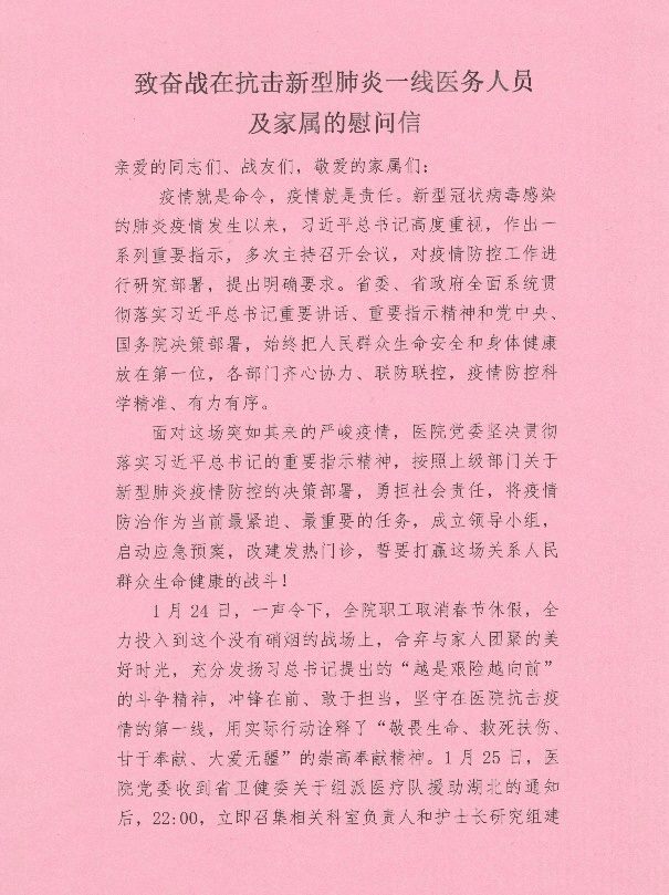 郑州大学五附院非常重视援鄂医疗队队员及家属的后保障工作,在医疗队到达武汉进行抗疫工作不久,医院党委就发出慰问信,向奋战在新型肺炎一线的医务人员及家属感谢和最崇高的敬意。
