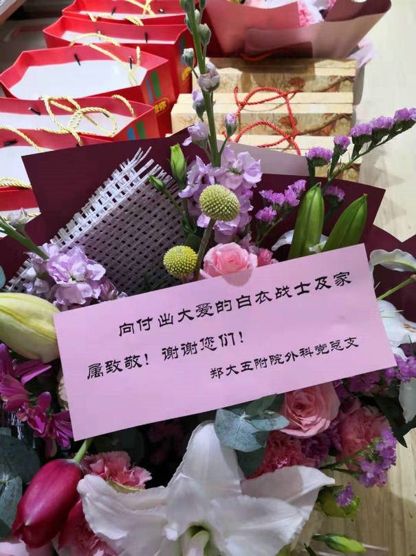 医疗队员所在党总支、党支部集体购买了鲜花和慰问品,因特殊时期无法登门致意,采取快递的形式寄到队员的家中。致谢卡上写道:向付出大爱的白衣战士及家属致敬!谢谢您们!