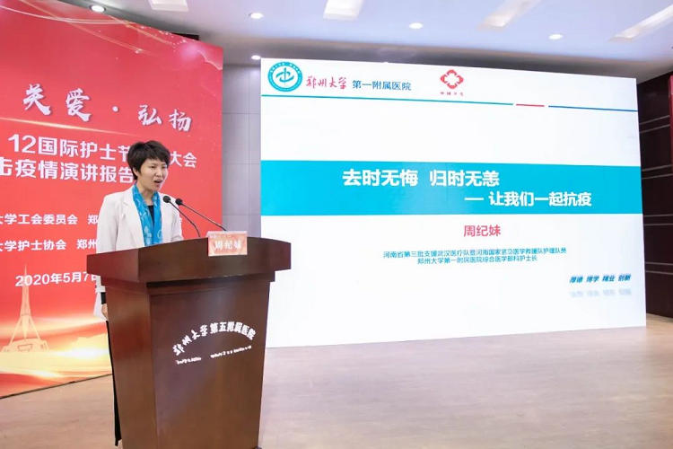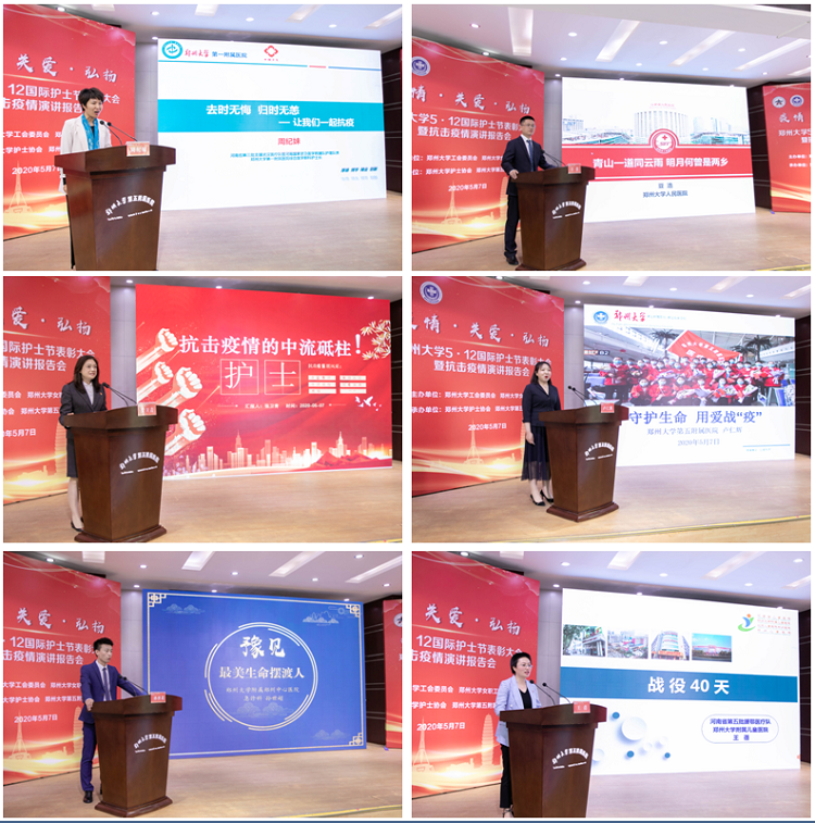 在抗击疫情演讲报告会中,郑州大学护士协会副主委、秘书长,郑州大学护理与健康学院副院长张艳饱含深情地主持让在场人员为之动容。来自郑州大学一附院、郑州大学人民医院、郑州大学二附院、郑州大学五附院、郑州大学附属郑州中心医院、郑州大学附属儿童医院的周纪妹、豆浩、张卫青、卢仁辉、孙世超、王蓓6名援鄂“优秀护理人”作演讲报告。报告精彩展现了她们冒着生命的危险奋战在抗击疫情的最前线,守护生命安全、筑牢健康防线,抒写抗击疫情中的大爱豪情,彰显了郑州大学护理人的热血、魄力、责任和担当,传递了满满的正能量,同时也让今年的“5·12国际护士节活动”内容更加丰富、饱满,在场人员不禁潸然泪下。