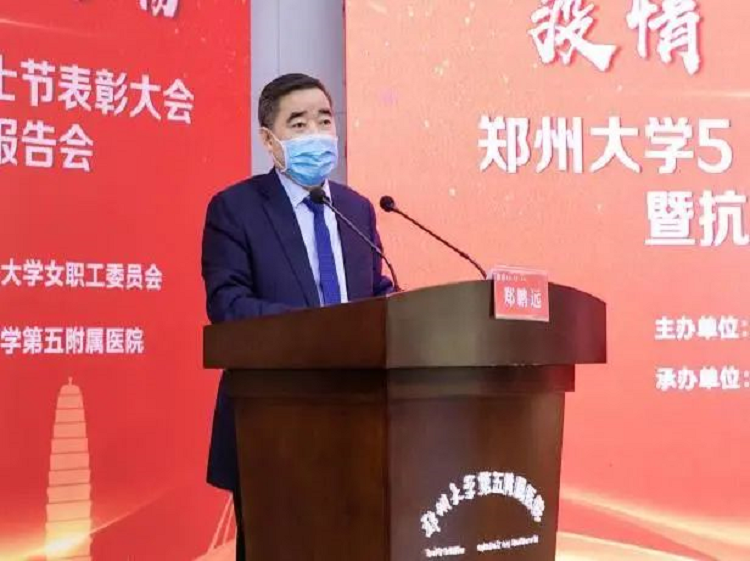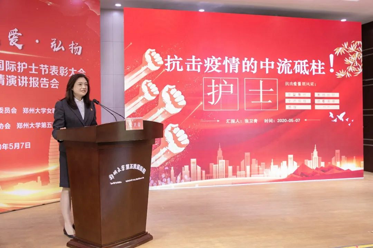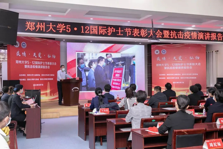 5月7日上午,在第109个“5·12”国际护士节来临之际,由郑州大学工会委员会、女职工委员会主办,郑州大学护士协会、郑州大学五附院承办的以“疫情·关爱·弘扬”为主题的“郑州大学5·12国际护士节表彰大会暨抗击疫情演讲报告会”通过“现场+直播”形式在郑州大学五附院举行。郑州大学党委副书记、工会主席,医学院党工委书记谷振清,郑州大学副校长、医学院院长董子钢,郑州大学工会副主席、女工委主任王盛枝,郑州大学工会办公室主任胡功华,女工委副主任刘鑫,郑州大学护士协会主任委员陈长英,郑州大学护士协会副主委、秘书长,郑州大学护理与健康学院副院长张艳,郑州大学五附院党委书记王新军、院长郑鹏远,党委副书记、工会主席徐翠英,副院长王少亭以及护士协会各成员单位领导、护理部主任和优秀护士代表等50余人参会,线上20000余人观看。开幕式由郑州大学五附院党委书记王新军主持。