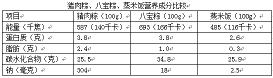 这里有图有真相:我们把超市常见的八宝粽和肉粽子的营养成分与蒸米饭做一个比较: