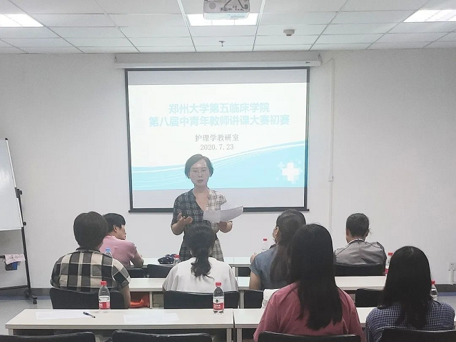 为调动全院青年护理教师积极性,提高护理教学能力,培养护理师资力量,按照郑州大学第五临床学院第八届中青年教师讲课大赛安排,护理学教研室于2020年7月23日、24日下午在规培楼五楼成功举行护理组初赛。护理教研室主任刘方,副主任李玉萍、史玉霞,科护士长孙敏、傅华平、高志平、侯保秋及两名学生代表,担任本次初赛的评委,按照评分标准从教学内容、教学手段、ppt制作、仪容仪表等多个方面进行综合评分,选拔出优秀护理教师晋级复赛。