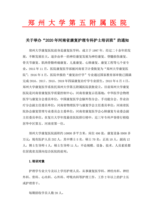 附件1-郑州大学五附院2020年河南省康复护理专科护士培训申请表