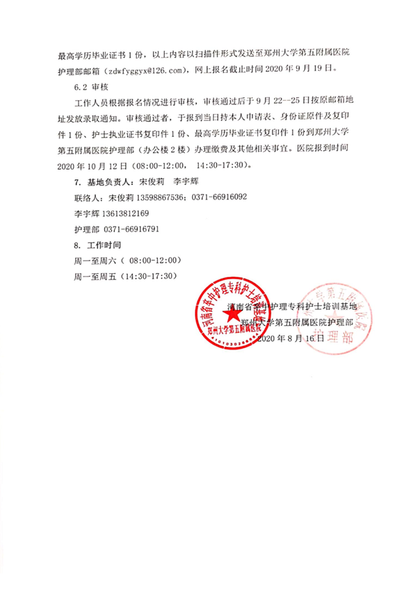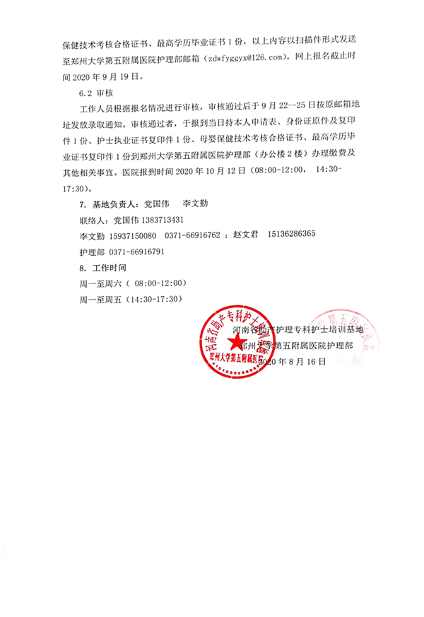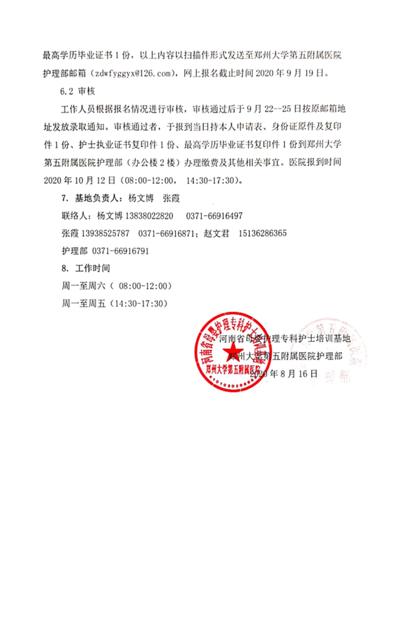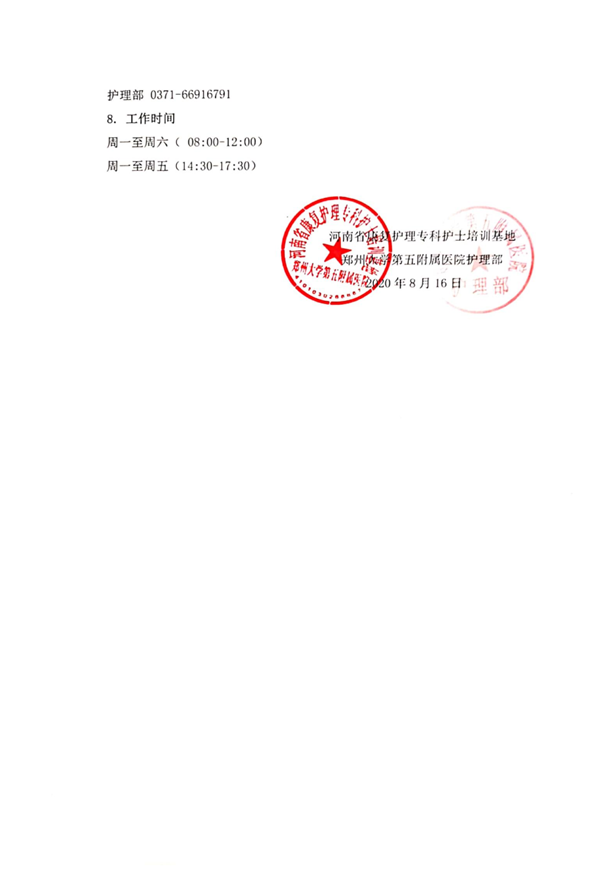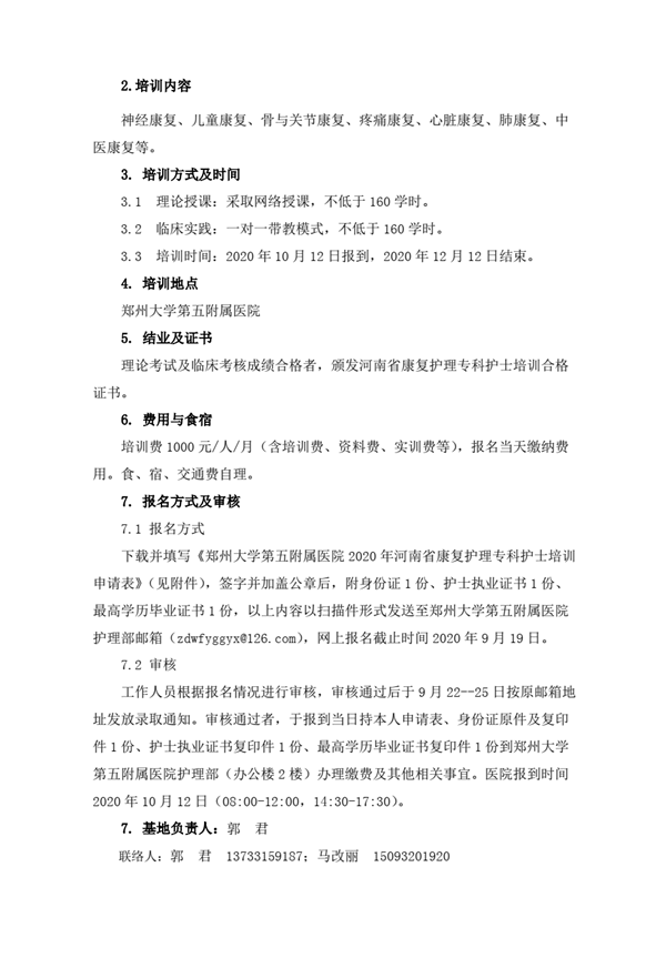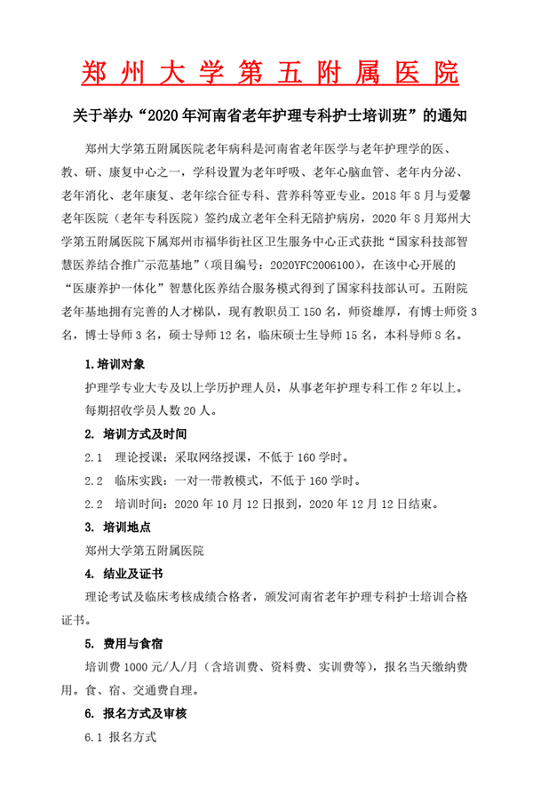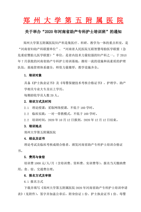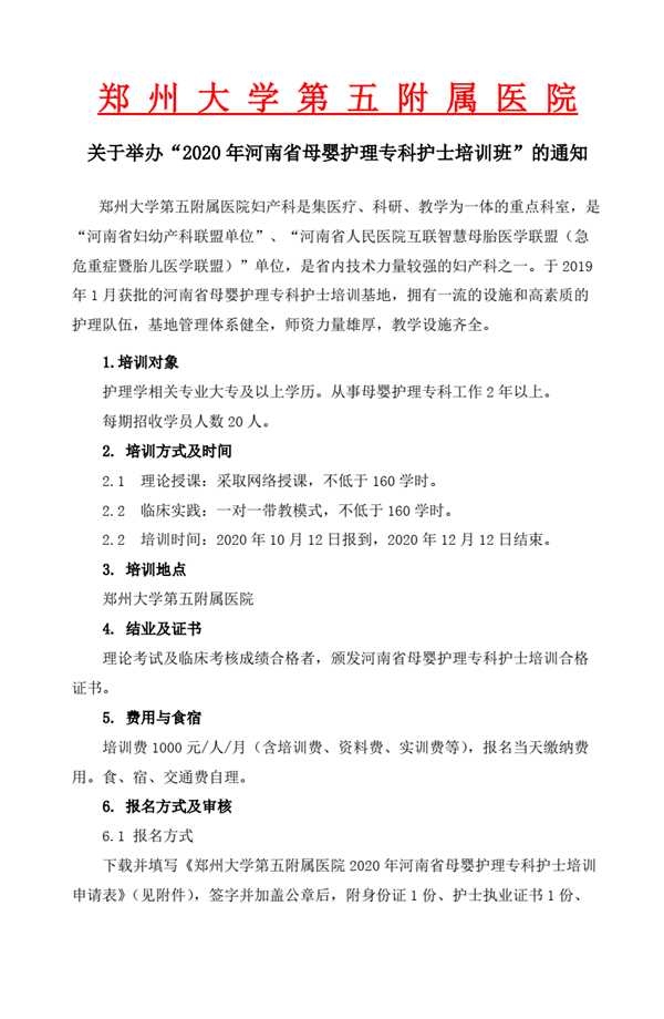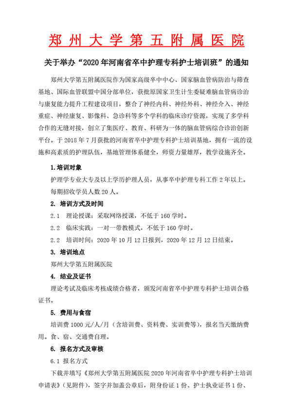 为积极响应国家卫生健康委《全国护理事业发展规划(2016-2020年)》(国卫医发(2016)64号)和河南省卫生健康委《河南省护理事业发展实施方案(2017-2020年)》(豫卫医(2017)46号)等文件精神,深入贯彻落实河南省“十三五”期间全面推进护士能力提升工程的要求,进一步加大专科护士培训力度及培训范围,持续提升省内专科护理服务能力,提高护理人才专科水平,郑州大学五附院决定于2020年10月举办河南省康复、卒中、老年、助产、母婴护理专科护士培训班,现将培训班相关事宜通知如下: