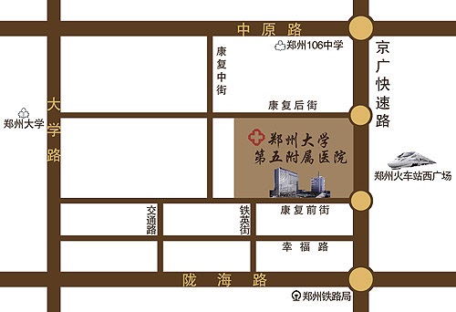 郑州市二七区康复前街3号(医院南门),二七区京广路与康复前街交叉口向北100米路西(医院东门,郑州火车站西广场对面)