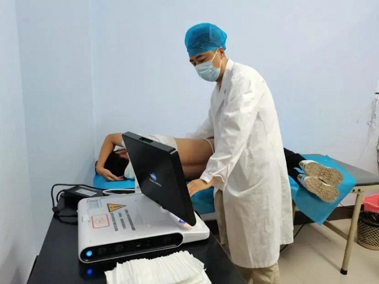在另一边的临时彩超室内,高兴才主任为每位患儿进行听诊、查体,耐心的为每位患儿家长讲解病情,认真查看患儿病历资料。超声诊断科秦龙飞医师细心为每一位患儿进行彩超辅助检查,帮助确诊病情。