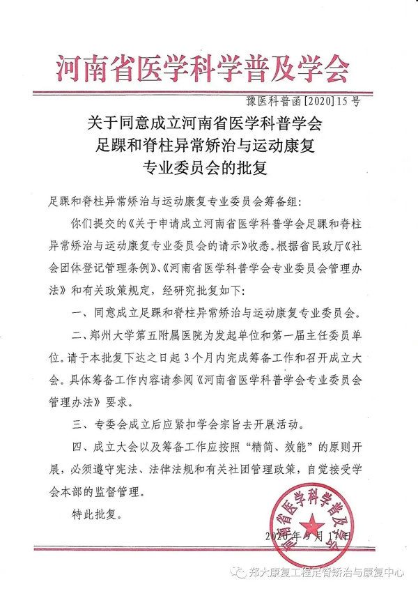 为了在全省范围内积极推广足踝和脊柱异常矫治与运动康复,加速河南省足踝和脊柱异常矫治与运动康复的发展,促进足脊诊疗和姿势矫正与运动康复的规范化与标准化,把推动和普及足脊诊疗和姿势矫正与运动康复知识作为预防和治疗青少年肌骨异常发育、运动障碍、运动损伤、人体结构失衡之下的应力颈肩腰腿痛等,作为学科间医工完美融合的模式在全省的发展和临床应用,促进全省各地区足踝和脊柱异常矫治与运动康复组织之间和从业人员之间,以及与其他有关学科之间的交流与合作,以此在河南省医学科普学会的批复和推动下依托郑州大学第五附属医院(郑州大学康复医院)成立“河南省医学科普学会足踝和脊柱异常矫治与运动康复专业委员会”,现已正式获批为发起单位及主任委员单位。目前正式面向全省有意向开展足脊矫治与运动康复的医疗单和个体开展专委会委员招募工作。
