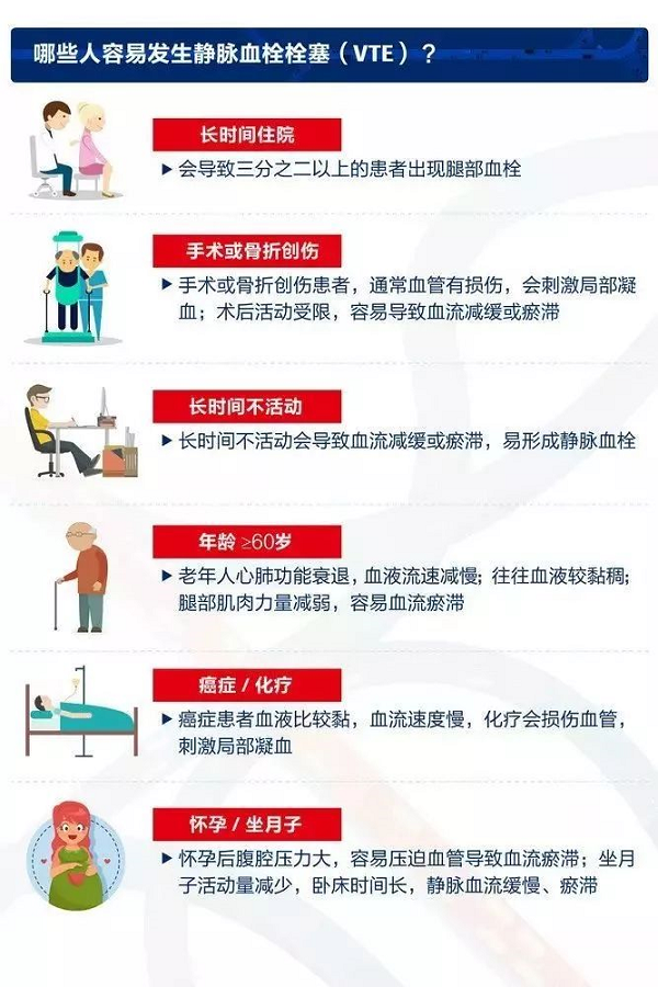 高龄、肥胖、大手术后或严重创伤、恶性肿瘤或化疗患者、妊娠/产后/口服避孕药或激素替代治疗、肢体制动(如长时间乘坐交通工具等) 、长期卧床、脑卒中、心肺功能衰竭、重症感染、静脉血栓病史、凝血相关因子异常等。