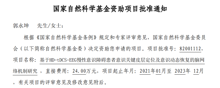 王新军教授团队一直从事于颅脑损伤后意识障碍的研究,此次获得国家自然青年科学基金资助的是王新军教授团队的郭永坤医生,项目主要研究内容为基于HD-tDCS-EEG慢性意识障碍患者意识关键皮层定位及意识动态恢复的脑网络机制研究。慢性意识障碍(DOC)包括持续性植物状态(PVS)和微意识状态(MCS),该研究应用高精度经颅直流电刺激仪(HD-tDCS)调控MCS患者的前额叶和后顶叶皮层,同时记录行为和脑电信号,应用适当的统计方法,评估刺激的干预效果。该研究针对目前国际上热门的NCC定位问题提出了独特的解决方案,具有相当的创新性。意识问题是人类脑科学重大问题,DOC临床处置是康复领域的巨大挑战,因此该研究在DOC的研究及治疗方面具有重要的科学价值和临床应用价值。