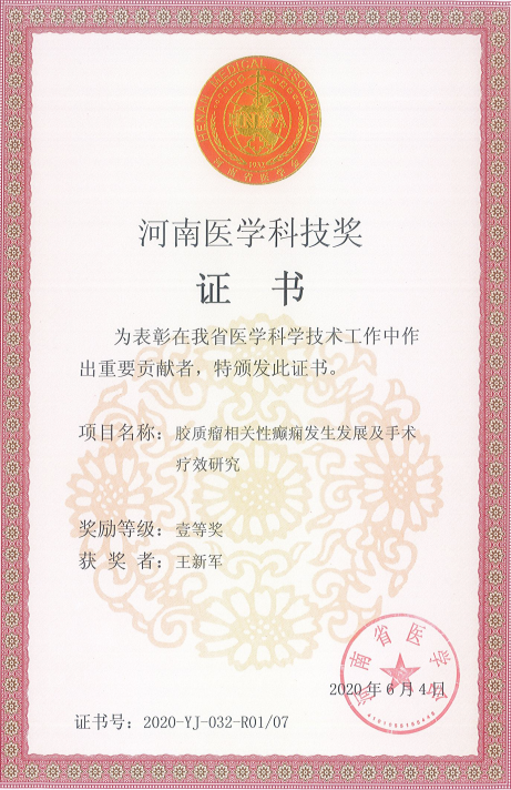 ▲ 2020年王新军教授获河南省医学科技一等奖