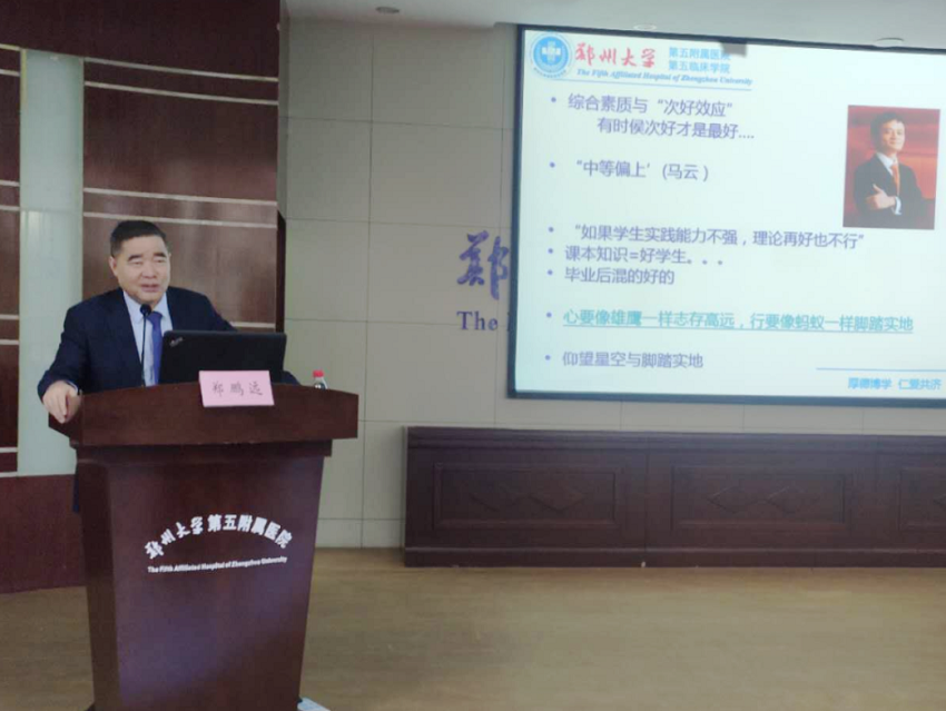 郑州大学五附院院长郑鹏远教授首先向同学们的到来表示了热烈的祝贺,同时从“奋斗、坚持、责任”三方面为同学们的未来提出了建议和希望:心要像鹰一样志存高远、行要像蚂蚁一样脚踏实地。须耐得住寂寞,经得起挫折,在“悬思——苦索——顿悟”中寻求科学的真谛。在学习工作中要树立责任意识、团队意识,承担起历史赋予的职责。他祝同学们在研究生学习阶段能学有所成,为五附院的发展壮大做出自己的贡献。