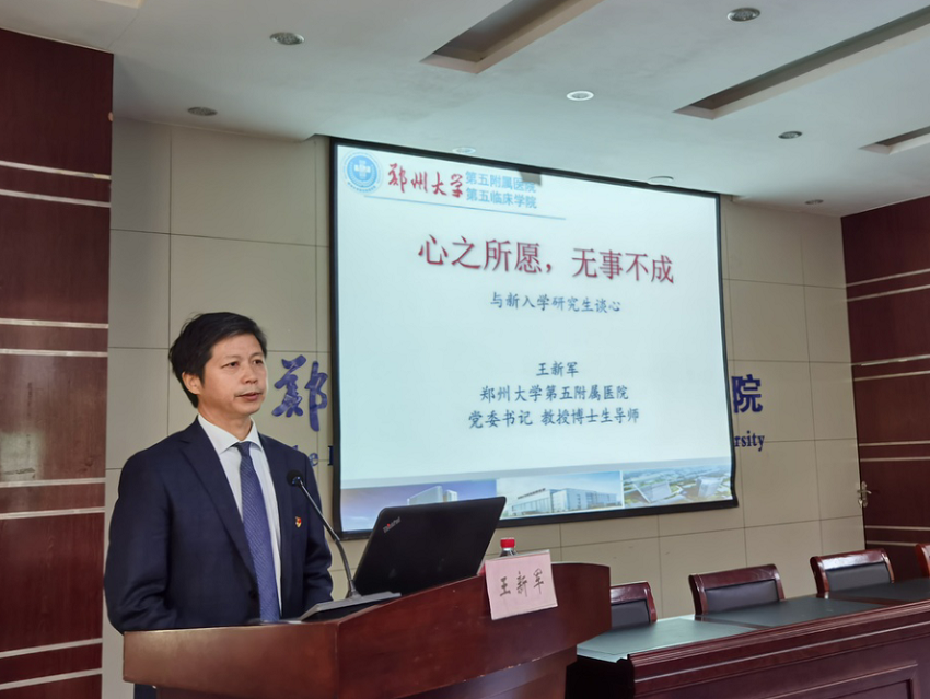 郑州大学五附院党委书记王新军教授以“心之所愿,无事不成——与新入学研究生谈心”为题,向同学们讲述了郑州大学五附院的百年历史,同时以医院先贤前辈:梅祖懿、孔祥光、胡佩兰为例,鼓励同学们“立志”“追梦”,在奋斗的道路上砥砺前行,警示同学们“人才有高下,知物由学。”梦想从学习开始,事业靠本领成就。最后,王书记寄语同学们:“天地转,光阴迫。一万年太久,只争朝夕。”