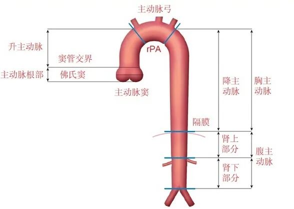 胸主动脉是体循环的动脉主干(图1),起于心脏的左心室,根据胸主动脉行程可分为三部:主动脉升部(升主动脉)、主动脉弓和主动脉降部(降主动脉)。主动脉管腔直径大,在体内至关重要,类似我国的长江和黄河,因此也成为大动脉。主动脉管壁又可分为内膜、中膜及外膜三层(图2)。