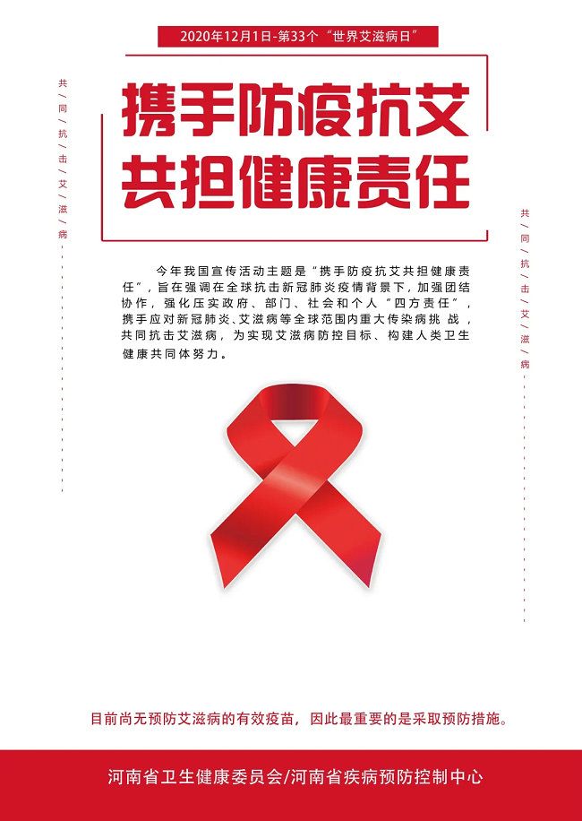 2020年12月1日是第33个“世界艾滋病日”。今年我国宣传活动主题是“携手防疫抗艾共担健康责任”,旨在强调在全球抗击新冠肺炎疫情背景下,加强团结协作,强化压实政府、部门、社会和个人“四方责任”,携手应对新冠肺炎、艾滋病等全球范围内重大传染病挑战,共同抗击艾滋病,为实现艾滋病防控目标、构建人类卫生健康共同体努力。