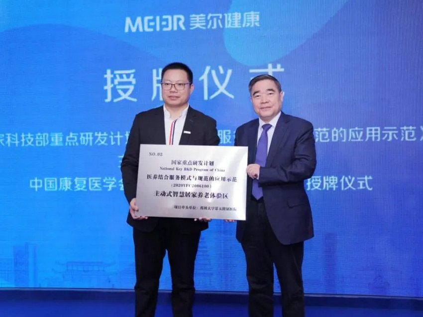 在此次论坛上,郑州大学五附院院长郑鹏远教授作为国家科技部医养结合重点研发计划项目负责人向杨庭树会长、徐卫华副会长颁发了项目指导专家聘书。同时向美尔国际医养社区中授予国家科技部医养结合重点研发计划项目“主动式智慧居家养老体验区”、中国康复医学会“医养结合示范基地”铭牌。