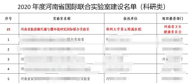 近日,河南省科学技术厅下发《关于同意建设2020年度河南省国际联合实验室的通知》(豫科〔2021〕10号),郑州大学五附院神经外科学科带头人王新军教授主持的河南省胶质瘤代谢与微环境研究国际联合实验室(Henan International Joint Laboratory of the Study on Glioma Metabolism and Microenvironment)经主管部门推荐、形式审查、会议评审、现场考察、厅长办公会研究审定、公示等环节,成功获批立项建设。
