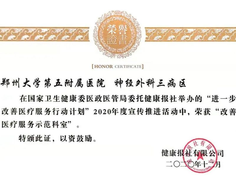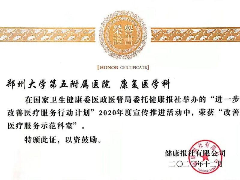 近日,由国家卫生健康委医政医管局和健康报社共同主办的2020年度改善医疗服务典型经验线上交流总结大会召开,郑州大学五附院荣获“改善医疗服务示范医院”,院长郑鹏远荣获“改善医疗服务突出贡献工作者”,医院康复医学科、神经外科三病区荣获“改善医疗服务示范科室”。同时,医院在“新时代 新后勤”2020年度全国医院后勤创新案例征集活动中,获评”医院后勤管理示范单位”案例。