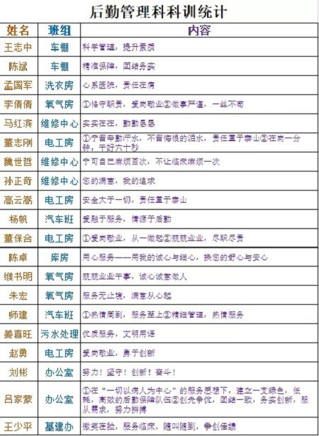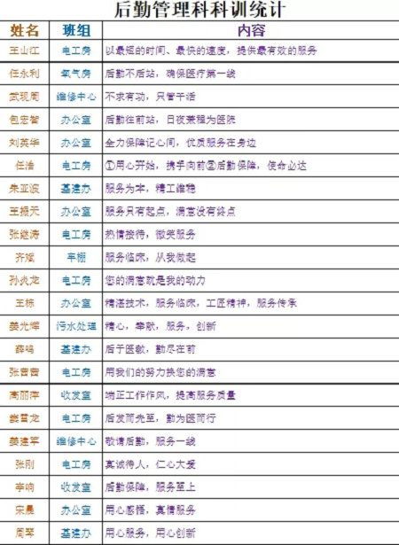 2020年12月13日,后勤管理科利用科室微信群开展科训征集活动。科训征集消息发出后,后勤全体职工踊跃参与,结合自身对工作的思考,凝练出科室文化建设的关键词。在不到两天的时间里,共征集到42条科训,参与人员有年近古稀的返聘员工王少平:“微笑在脸,服务临床,随叫随到,争创佳绩。”有入职不久的青年员工杨帆:“爱融于服务,情源于后勤”。