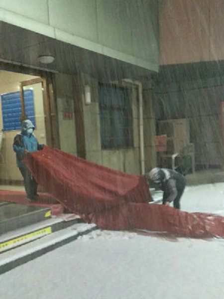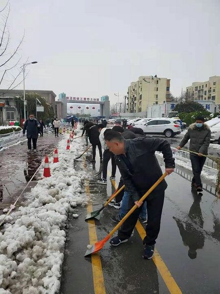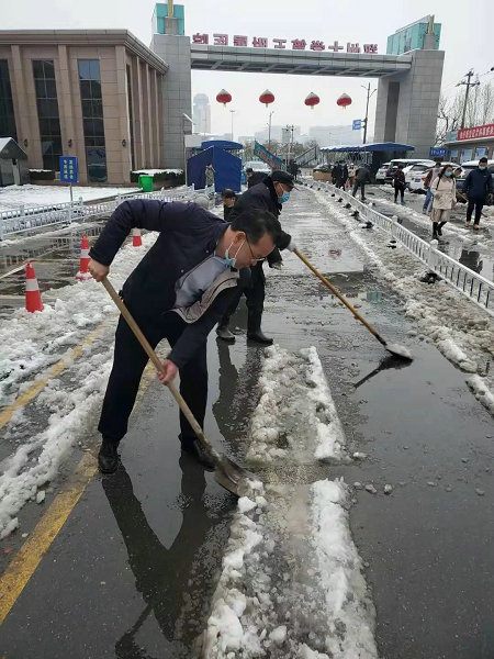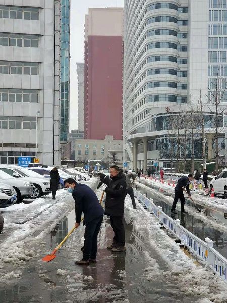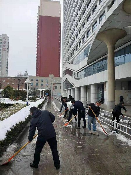 2021年2月24日夜晚,一场迟来的降雪光顾了省会郑州市。瞬间街道外已经一片银装素裹。考虑到积雪将给院内交通和医疗工作带来的不便,为了不影响第二天患者的正常就医及职工正常工作,在副院长傅聿铭的指挥和部署下,后勤管理科紧急启动应急预案,提前部署除雪工作,深夜准备好铁锨、手套、扫把等工具,并在后勤微信群发动后勤职工参与第二天清晨的除雪工作。