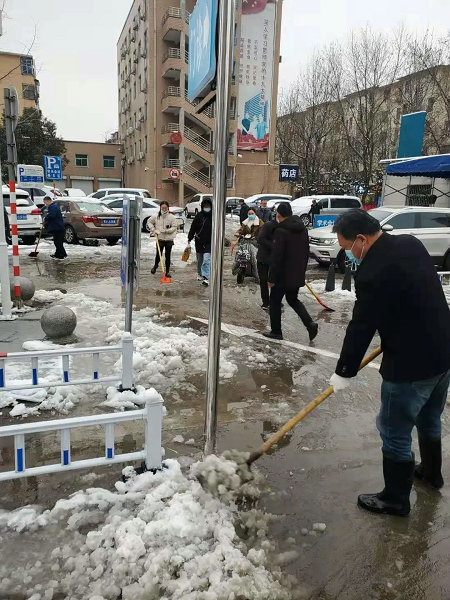 25日上午七点半,在机关第四党支部的带领下,后勤管理科全体职工以及物业公司、院区保安均参与到除雪保通畅工作中。天空中飘着细密的冻雨,志愿者们却不惧严寒,热火朝天除雪忙。医院大门、门诊楼、病房楼、办公楼前的主要通道都能见到除雪职工忙碌的身影,构成一道亮丽的风景线。
