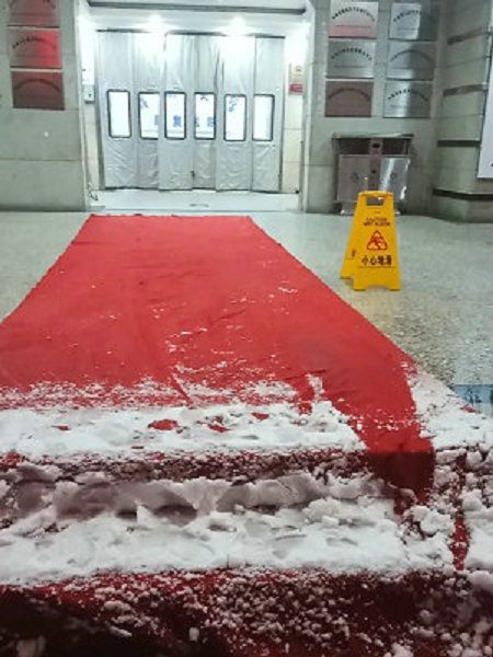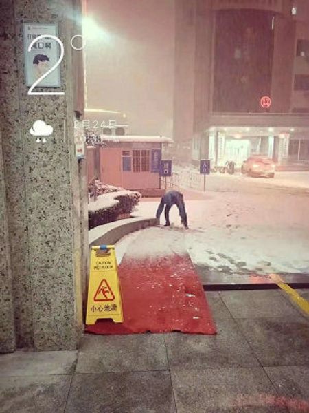 同时,物业公司还采取了撒盐、设立安全警示牌、在楼道内及门口处铺设防滑垫等措施,保障了就诊患者和职工的安全通行。
