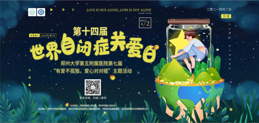 在世界自闭症日来临之际,为了让更多的人了解自闭症,关爱自闭症儿童,郑州大学五附院儿童康复医学科将于2021年4月1日上午举办第七届主题为“有爱不孤独,爱心对对碰”暨第十四个世界自闭症关爱日活动。