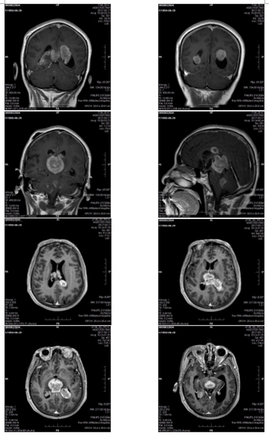 然而,好景不长,2017年5月16日,王大妈因突发意识模糊再次来到郑大五附院,复查头部MRI提示颅内肿瘤较前明显增大,且病变波及到脑干,脑脊液循环受阻。经放疗科主任医师王晓瑜主任会诊考虑颅内多发占位,恶性淋巴瘤可能性大,不排除生殖细胞瘤。当时病人神志模糊,下肢肌力0级,大小便失禁,病情危重,随时有呼吸、心跳骤停的风险。但肿瘤细胞对放射线敏感,经积极地放射治疗有可能挽救病人生命。但放疗风险大,可加重脑水肿。经与患者家属反复沟通,最终家属接受了放射治疗。然而,通过放疗究竟能否成功挽回王大妈的生命,这仍然是个未知数,也是所有人在面临的极大考验。