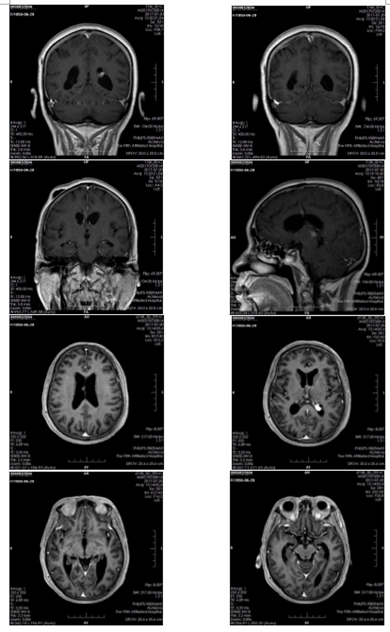 2017年4月29日,王大妈来到了郑大五附院接受治疗,先是住进了神经外科,神经外科主任医师寿纪新主任介绍说:“当时病人外院核磁共振显示两侧脑室、三脑室、四脑室及松果体内见多发占位,合并梗阻性脑积水、脑室周围脑白质间质性脑水肿及脊髓转移,病情重,病灶广泛,无法手术切除”。为缓解脑积水,给病人进行了“三脑室底造瘘+脑室腹腔分流术”,手术后患者病情稳定、症状改善出院。