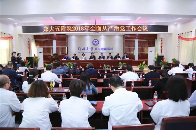 2018年4月26日下午郑州大学五附院2018年全面从严治党工作会议在门诊五楼会议室召开。院党政领导、各支部书记、科室负责人、护士长和诊疗组长近200人参加了会议。会议由院党委副书记、院长郑鹏远同志主持。