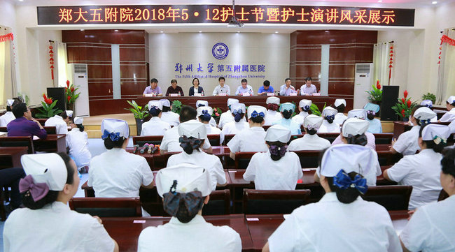 2018年5月9日下午郑州大学五附院2018年“5·12”国际护士节表彰大会暨护士演讲风采展示活动在门诊楼五楼大会议室隆重举行。院长郑鹏远,党委书记王新军,党委副书记、纪委书记徐翠英,副院长王兵、王少亭、傅聿铭、杨怀玉,工会主席朱光出席了本次活动,与全院护士长、200余名护士代表一起,共同庆祝 “5·12”国际护士节的到来。会议由副院长王少亭主持。