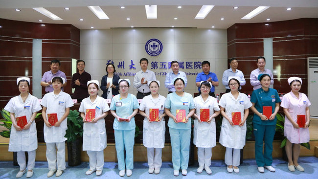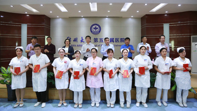与会院领导为获奖的优秀护士及先进集体代表颁发荣誉证书并合影留念。