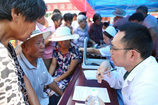 经过三个多小时的行程,大家抵达义诊现场。得知郑州的专家来秣陵镇义诊,秣陵镇办事大厅门前的道路被广大群众围的水泄不通。经过短暂的启动仪式之后,专家马上投入义诊的活动之中。义诊中,郑州大学五附院4名医务人员被群众围得密不透风,炎热的天气,焦急的群众,他们耐心的询问病史、把脉问诊、体格检查、检测血糖,并提出下一步治疗措施和用药情况。一会的功夫,专家们的衣服全部湿透,为了满足群众的医疗需求,也顾不上擦拭脸上的汗水,一直忙碌到中午12点多。午饭过后,经过短暂的休息,专家们又投入义诊活动中。下午四点半,这是预计返郑的时间。但是,当地的群众舍不得专家走,由于还有部分人没有得到专家的诊治,拉着专家的手不放开,专家们也不忍心不给他们看,于是决定把所有的人看完再走,义诊活动又延迟了半个小时。下午五点多,大家终于集合完毕,踏上返郑的路途。