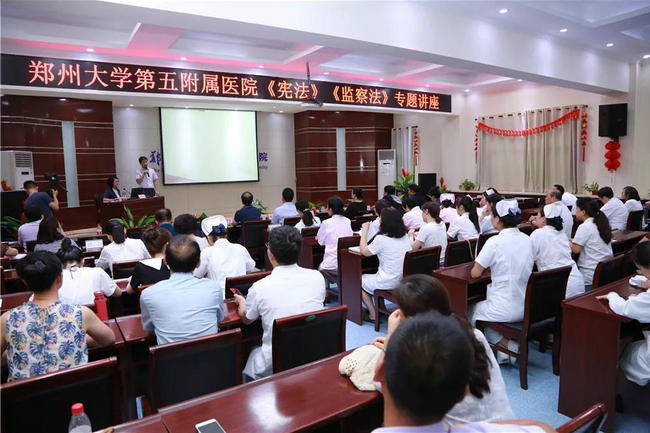 为全面贯彻党的十九届二中全会精神,深入学习习近平总书记在中共中央政治局第四次集体学习时的讲话精神,使全院党员干部树立忠于宪法、遵守宪法、维护宪法的自觉意识;为全面领会、准确把握监察法的核心要义和精神实质,增强法治意识和法治思维,筑牢拒腐防变的思想防线,7月26日下午,郑州大学五附院邀请郑州大学法学院郎志恒教授为党员干部作了《宪法》和《监察法》专题讲座。院领导及200多名党员干部参加了学习活动,专题讲座由党委书记王新军主持。