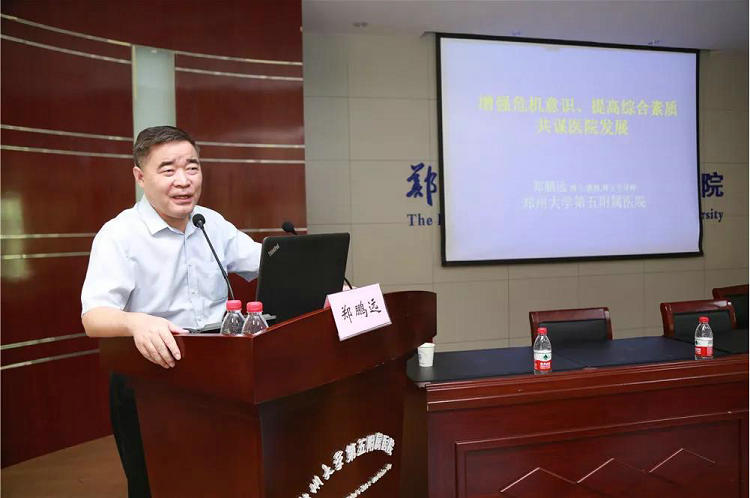 郑鹏远院长代表院领导班子及全体职工对新员工的到来表示了热烈的欢迎和祝贺。他首先简要介绍了医院的总体情况,分析了医院发展面临的机遇和挑战。其次就“提高综合素质、爱岗敬业和保持良好心态”这三个方面做了详细阐述,与在座的新员工畅谈了励志成才的人生启示,分享了做人做事的经验感悟。郑院长指出,建设一流医院,需要一流人才,医院的人才来源于青年的成长。作为新一代郑州大学五附院人,要有广阔的胸怀和视野,紧跟时代脉搏,从自身做起,加强学习,脚踏实地,牢记使命,努力使自己尽快成长,一步步扎实前行,为医院的发展助力。