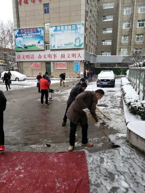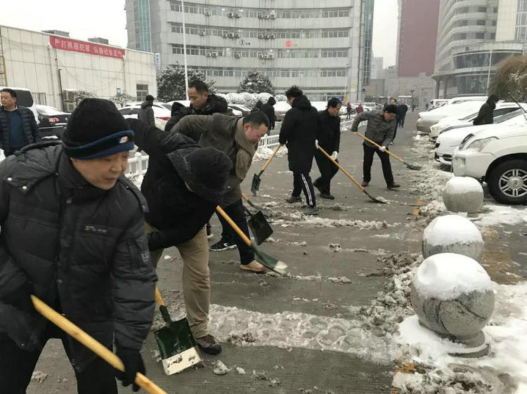 第二天早晨7:00,后勤管理科全体职工在医院南门集合,兵分三路对医院南大门道路、东大门门口道路及医院全部主干道进行清理。顶着寒风与大雪,后勤管理科职工认真有序、热火朝天的劳动,虽然很多人的手和脸都被冻得通红,但依旧没有影响大家的热情。经过大家的努力与配合,终于在8:00之前全部打扫完毕,用干净通畅的路面迎接患者与职工的新的一天。后勤管理科将持续关注天气,积极准备应急措施,保证道路通畅洁净及职工、患者交通安全。