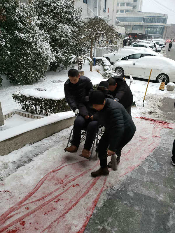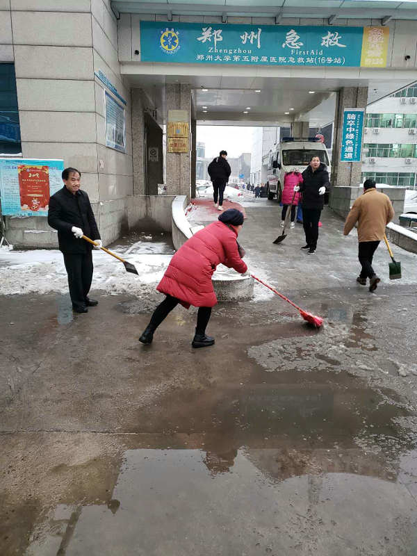 2019年2月13日上午开始,郑州市迎来了今年的第二场雪。这场大雪持续了一整天,道路积雪、路面结冰给前来郑州大学五附院就诊的患者和医院工作人员的通行带来极大的不便和安全隐患。按照院领导的指示,后勤管理科立即启动暴雪应急预案,在院区主要通道抛洒融雪盐和铺设防滑垫。由于提前抛洒融雪盐,院区内主要通道并没有厚厚的积雪,但是考虑到夜间温度持续走低且持续大雪,路面融化的雪水会因为夜间结冰积雪更难通行。后勤管理科长申佰胜通过微信通知全体后勤职工在第二天早晨扫雪除冰,并要求库房提前预备铁锨、扫把、手套等扫雪工具。