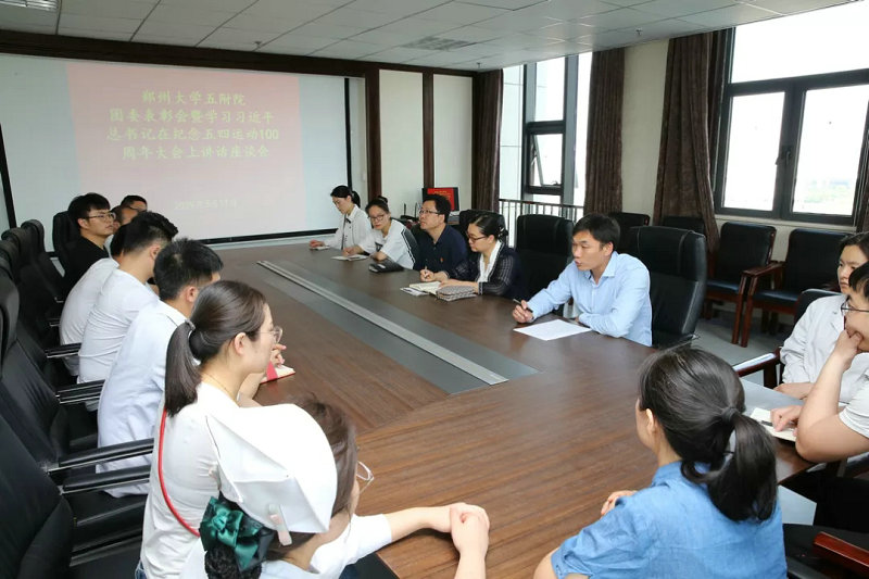 2019年5月17日下午,郑州大学五附院团委在规培楼10楼会议室召开纪念五四运动100周年大会座谈会。党委副书记徐翠英、宣传科科长王凯出席,团干和团员青年代表参加座谈会。座谈会由团委副书记吴彦勇主持。