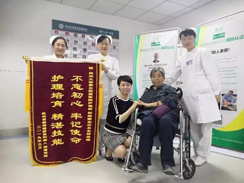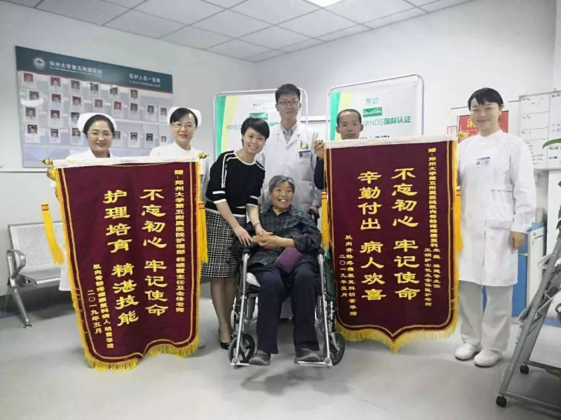 当胡素琴阿姨把一面写着“不忘初心,牢记使命,护理培育,精湛技能”的锦旗送到护理部韩晓霞主任的手上时说:“由衷地感谢郑州大学五附院护理部培养出了这么优秀的护理团队,出院后一直惦记着整个科室护士对她的关爱之情。这次她不顾路途遥远,专程让家人推着轮椅辗转到医院,就是为了表达对护理部的感谢。”