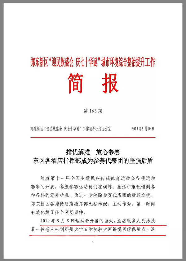 2019年9月10日,大河锦悦保障点收到了一封来自陕西代表团的表扬信,信中提到陕西代表团中年龄最大和年龄最小的队员得到了郑州大学五附院驻地医疗专家的救治与帮助,他们对郑州大学五附院医疗保障组表示衷心感谢。