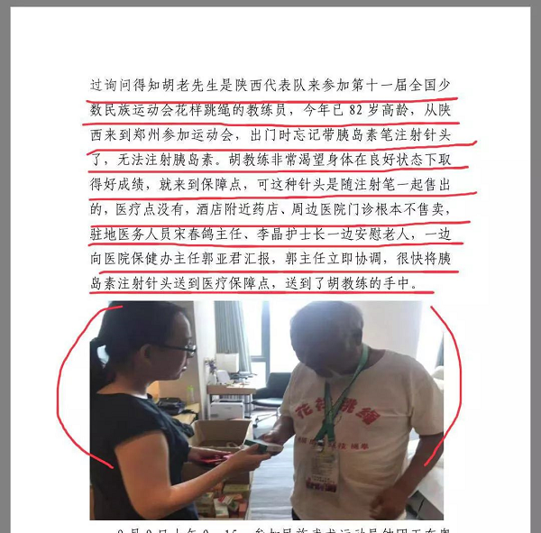 郭主任得知后立即协调就近医院,很快将胰岛素注射针头送到医疗保障点。宋春鸽主任医师、李晶护士长立即将针头送到了胡教练的手中,老人家执意要付钱,宋春鸽主任医师和李晶护士长告诉他:“保障您的健康是郑州大学五附院医疗保障组的职责,我们代表医院也代表河南父老乡亲祝您在运动会上取得优异成绩!”