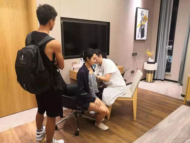 马颖光副主任为运动员巡诊、发放预防感冒药品、心理疏导、健康知识宣教。