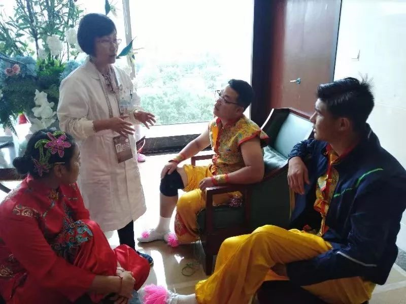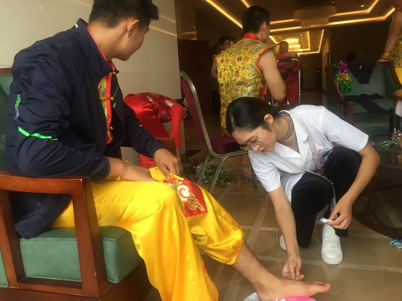 花样跳绳队受伤队员多,为确保他们以良好状态参赛,医疗组两名医务人员9月14日一大早来到训练场地为受伤运动员们复诊、涂药,并进行训练健康指导,花样跳绳队在比赛中取得了优异成绩。