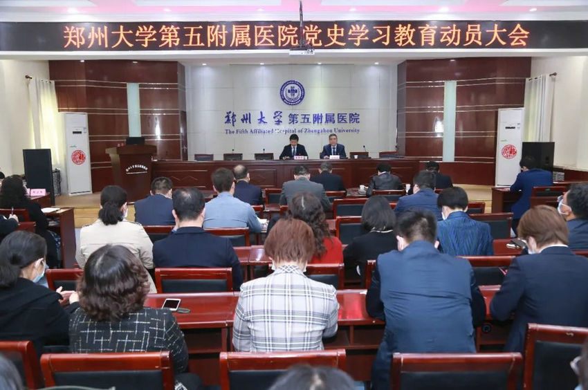 为深入学习贯彻习近平总书记在全国党史学习教育动员大会上的重要讲话精神,认真贯彻落实中央和省委、学校党委部署要求,2021年4月8日下午,郑州大学五附院在门诊五楼会议室召开党史学习教育动员大会。院领导、党(总)支部书记、科室负责人、教研室主任、护士长等200多人参加。党委副书记、院长郑鹏远主持会议。